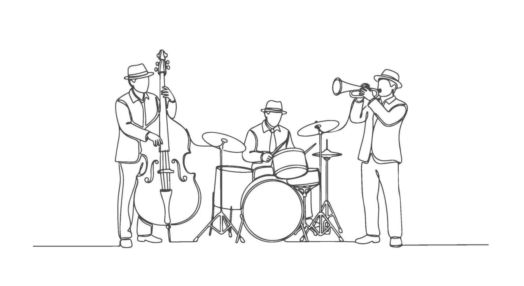 A continuous one line drawing illustration of a jazz band playing instruments, a single line art sketch Pro Vector