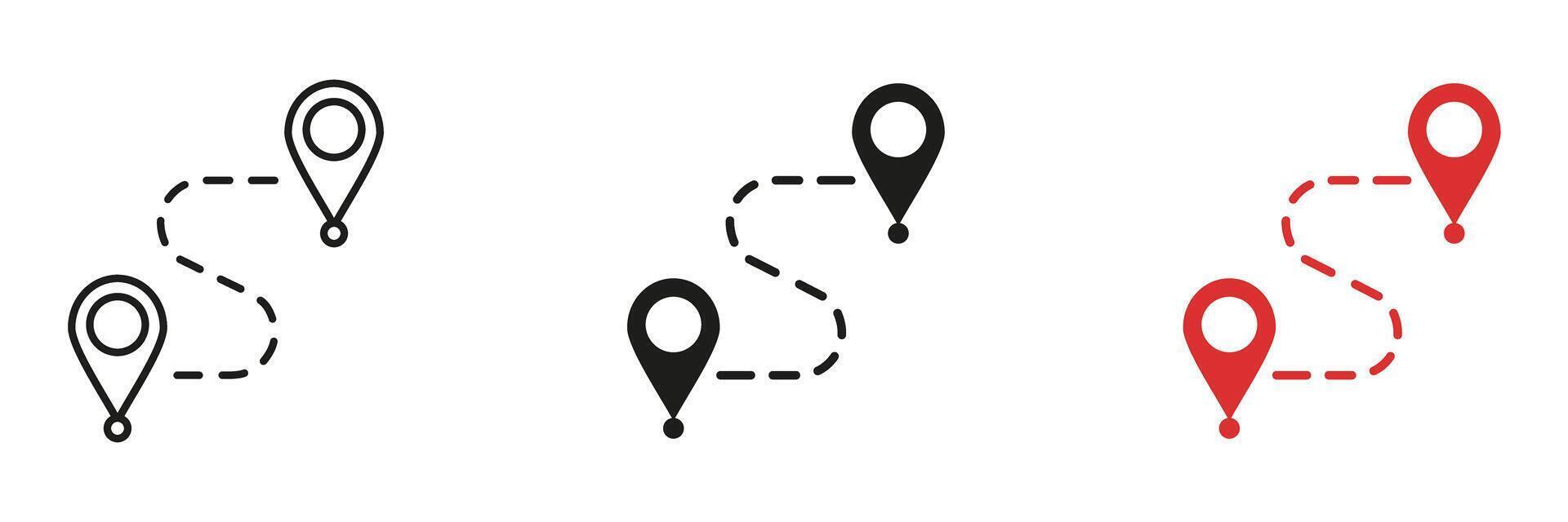 Map Route with Anchored Pin Markers Line and Solid Icon Set. Geolocation Destination with Pointed Tracker Symbol Collection. Isolated Illustration Pro Vector