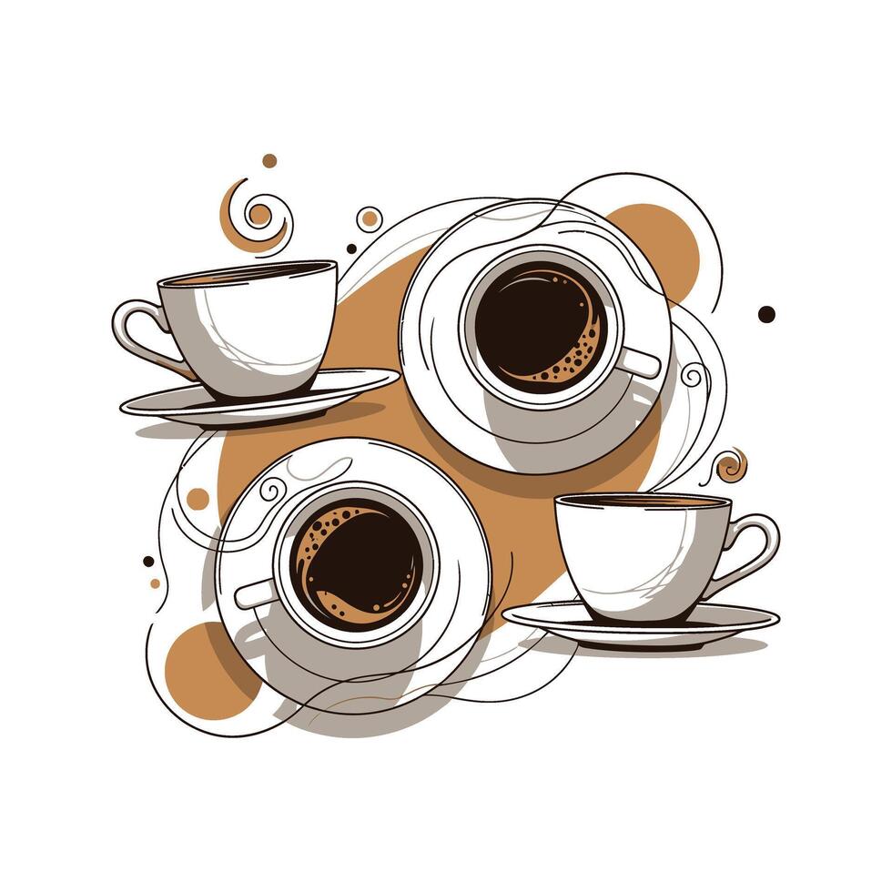 Abstract design of four steaming coffee cups on saucers with swirling patterns Pro Vector