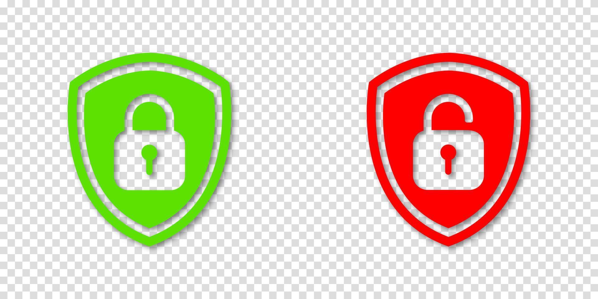 A green lock and red unlock padlock with shield icons This security clipart is designed for websites or mobile apps providing security information Pro Vector