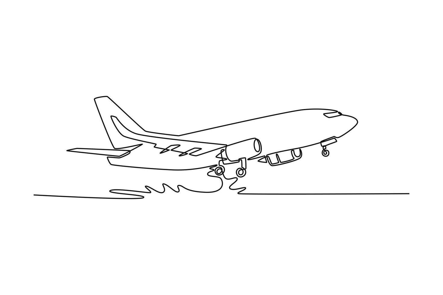 Aircraft landing on the runway, flight before touching the asphalt. Landing and take off plane concept. Single line draw design. graphic illustration Pro Vector