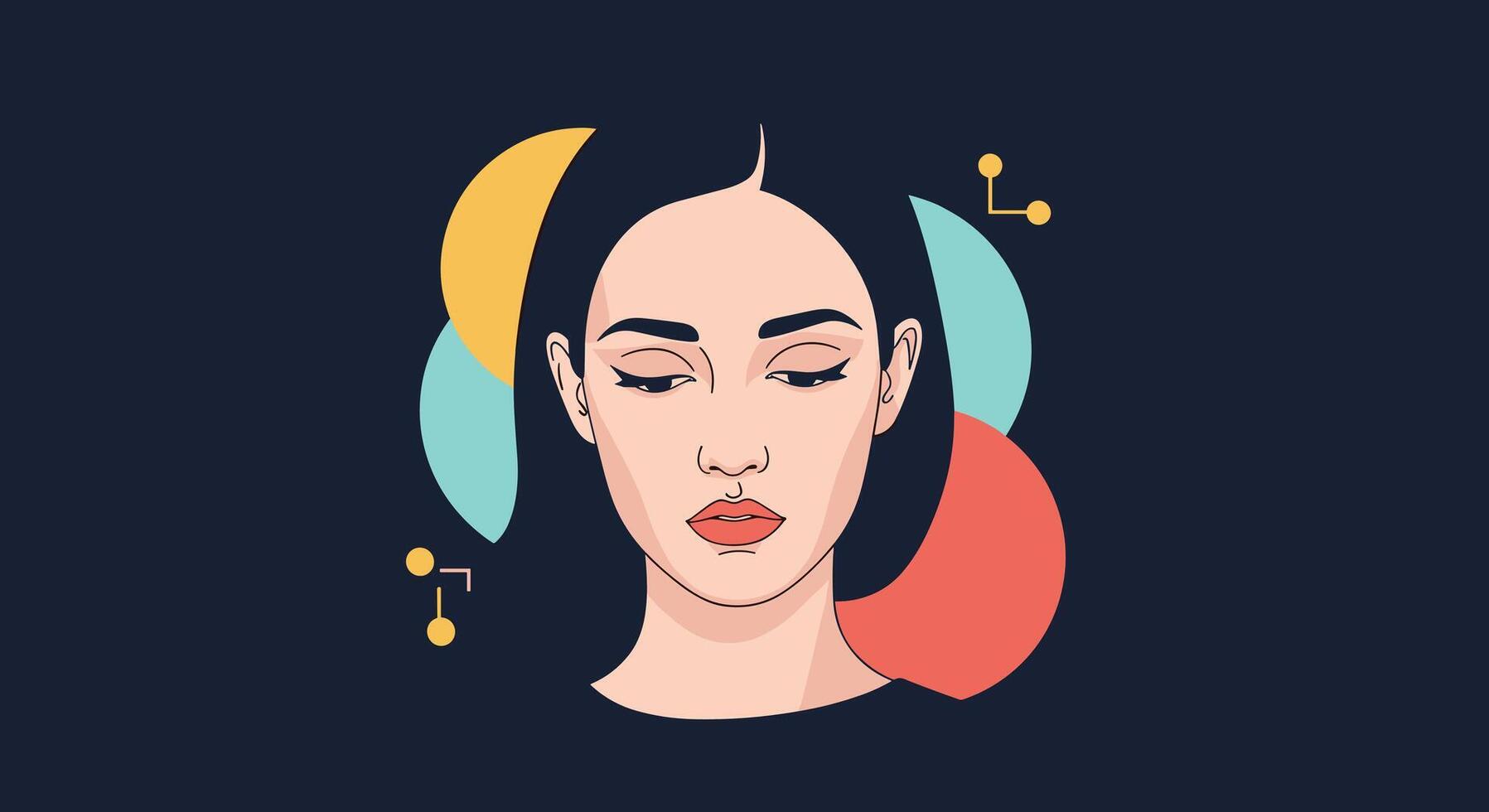 A serene woman's face is framed by abstract geometric shapes in muted tones, evoking a sense of calm and introspection, perfect for wellness concepts. Pro Vector