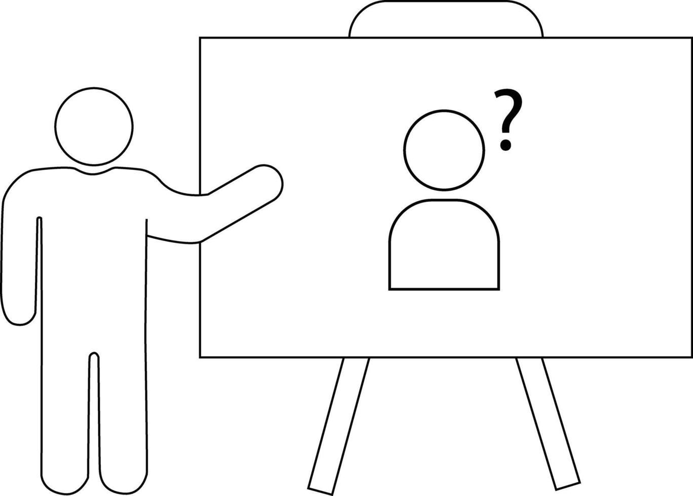A stick figure presents a drawing of another stick figure marked with a question mark on an easel Pro Vector
