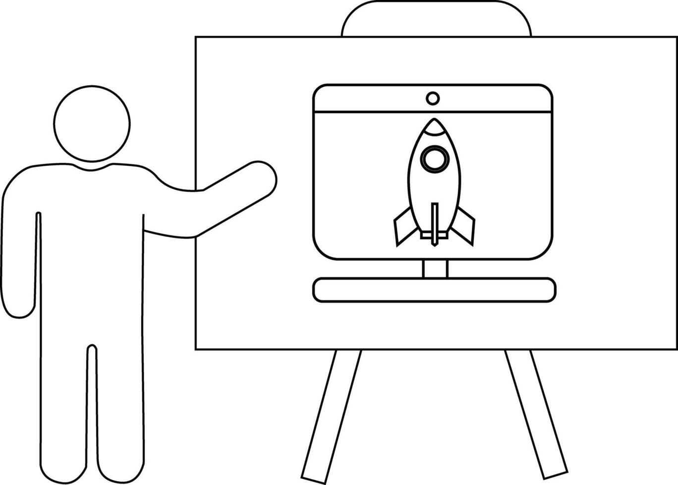 A person presents a rocket launch displayed on a monitor atop a stand Pro Vector