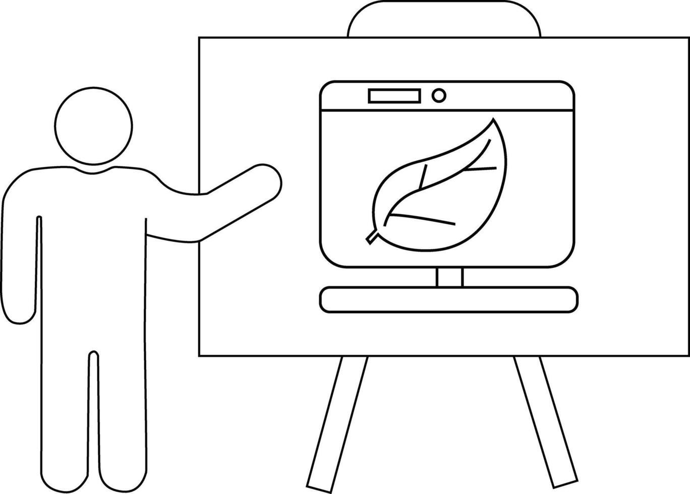 Person gesturing towards an easel with a screen displaying a leaf symbol Pro Vector