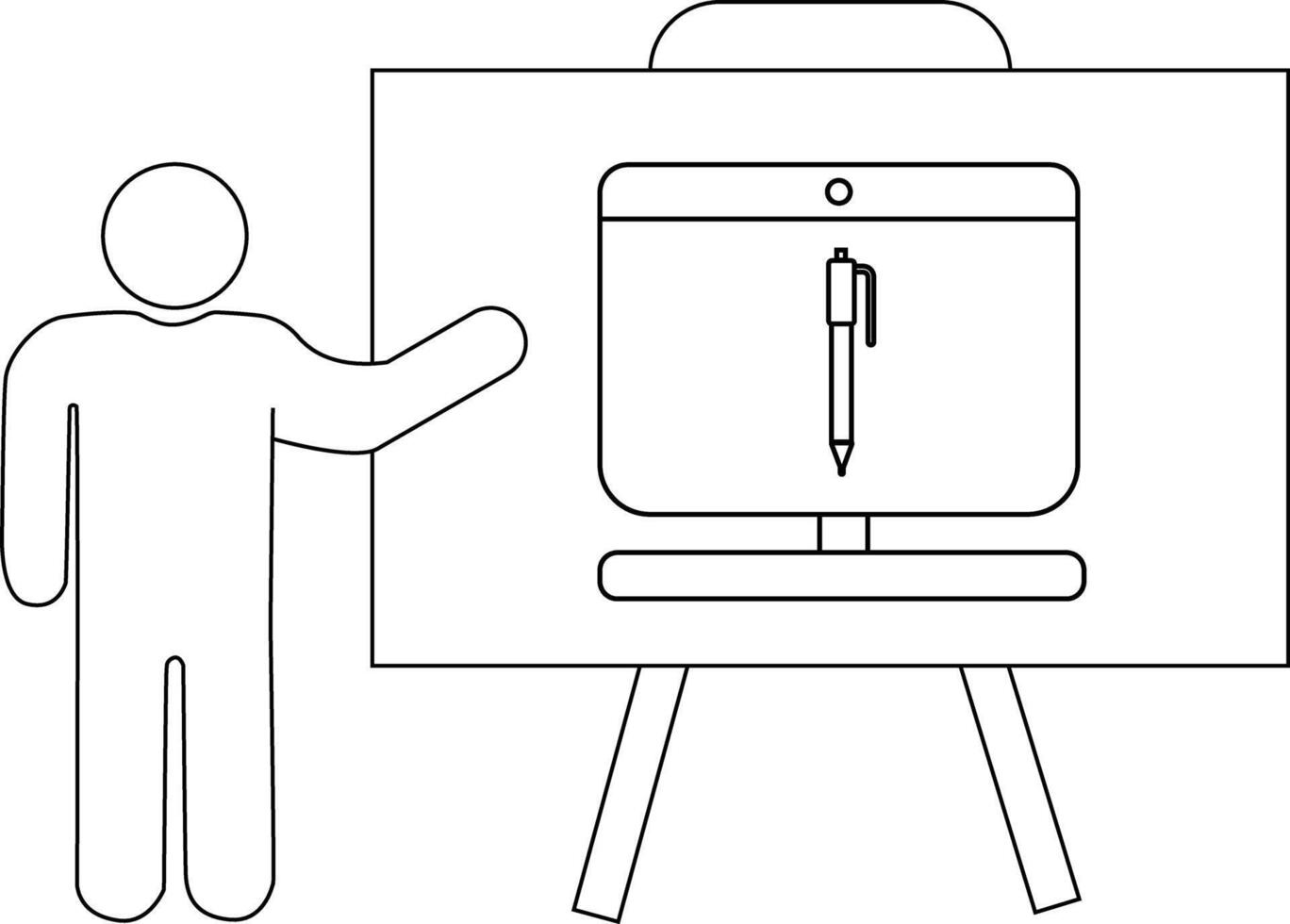Illustration of a presentation board showing a computer screen with a pen with a person presenting next to it Pro Vector