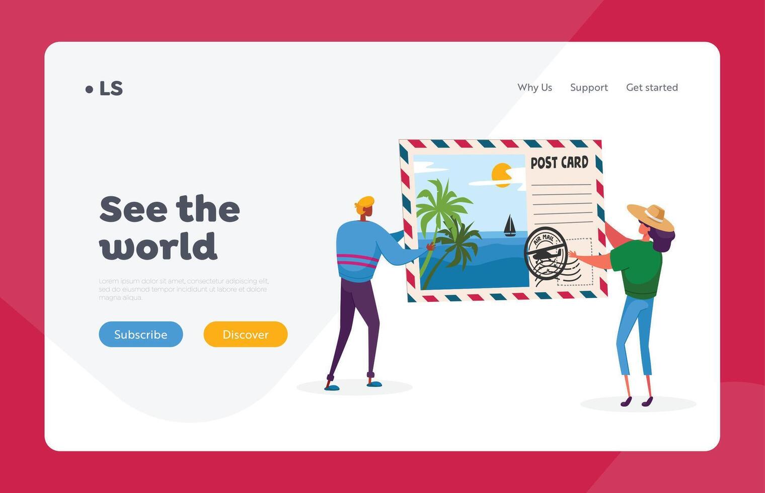 Memory After Traveling Landing Page Template. Tiny Characters Holding Huge Postcard with Tropical Beach and Palm Trees Pro Vector