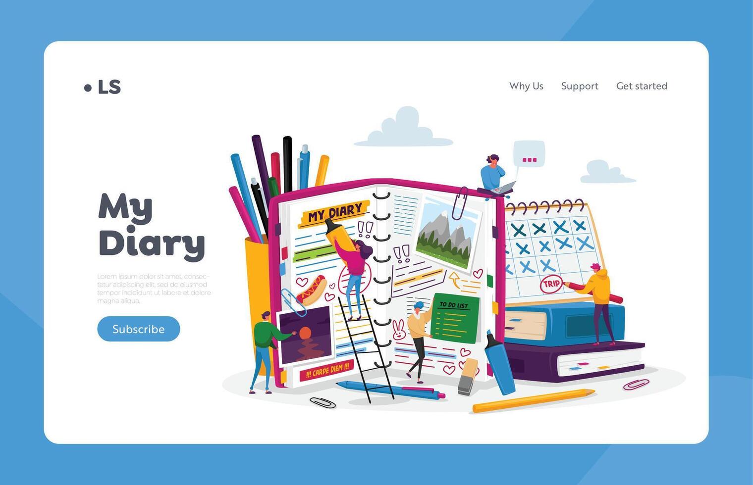 Organizer, Notebook Landing Page Template. Tiny Characters at Huge Diary Writing Notes, Planning, Fill To Do List, Pro Vector