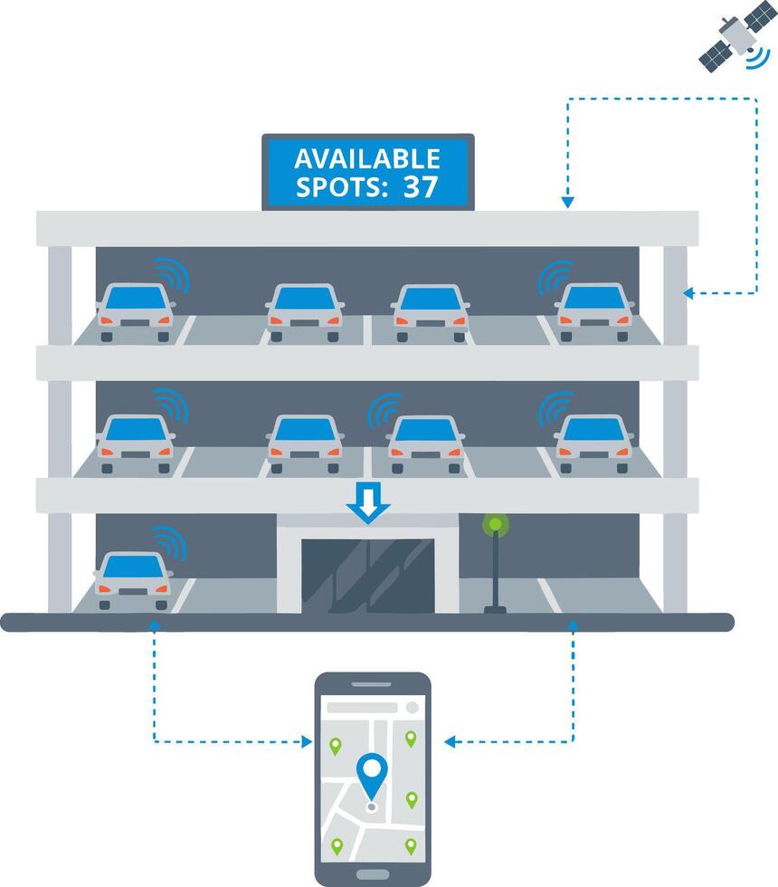 Flat Illustration of Smart Parking Building with Available Spots Connected to App Pro Vector