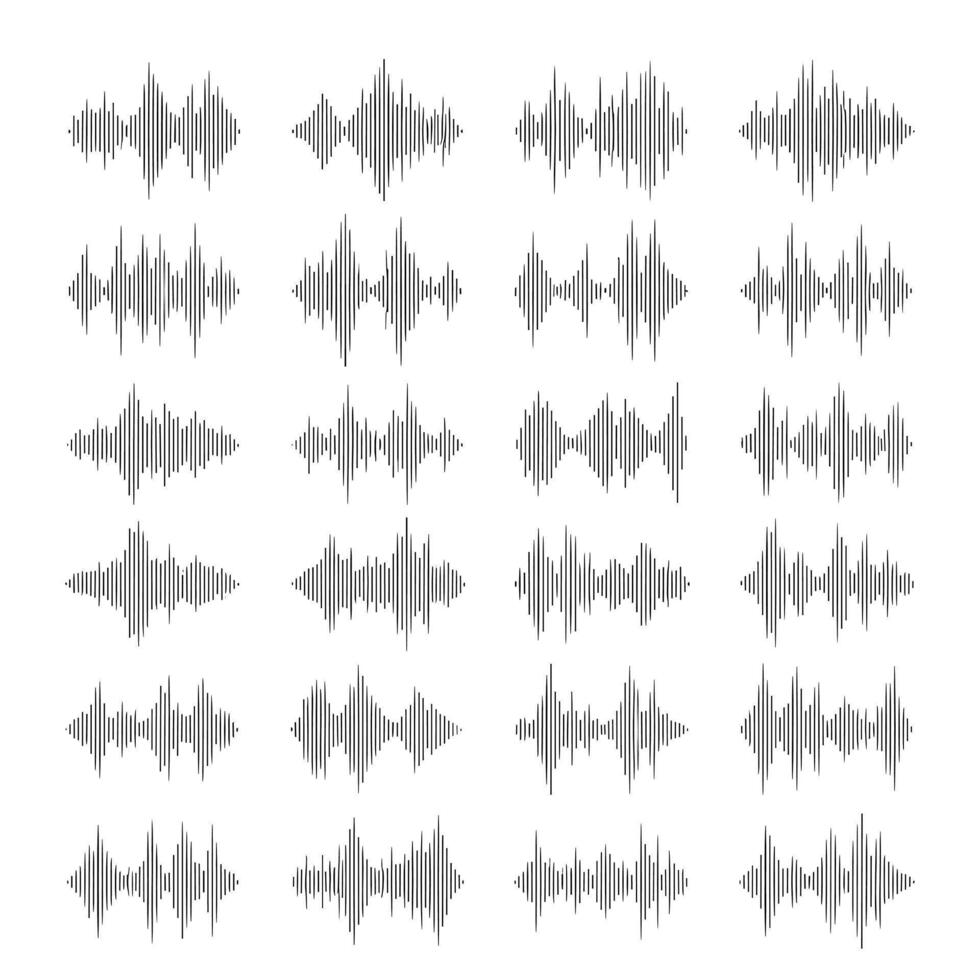 Sound wave collection isolated on a diverse array of audio waveforms, showcasing variations in amplitude and frequency, perfect for audio design projects Pro Vector