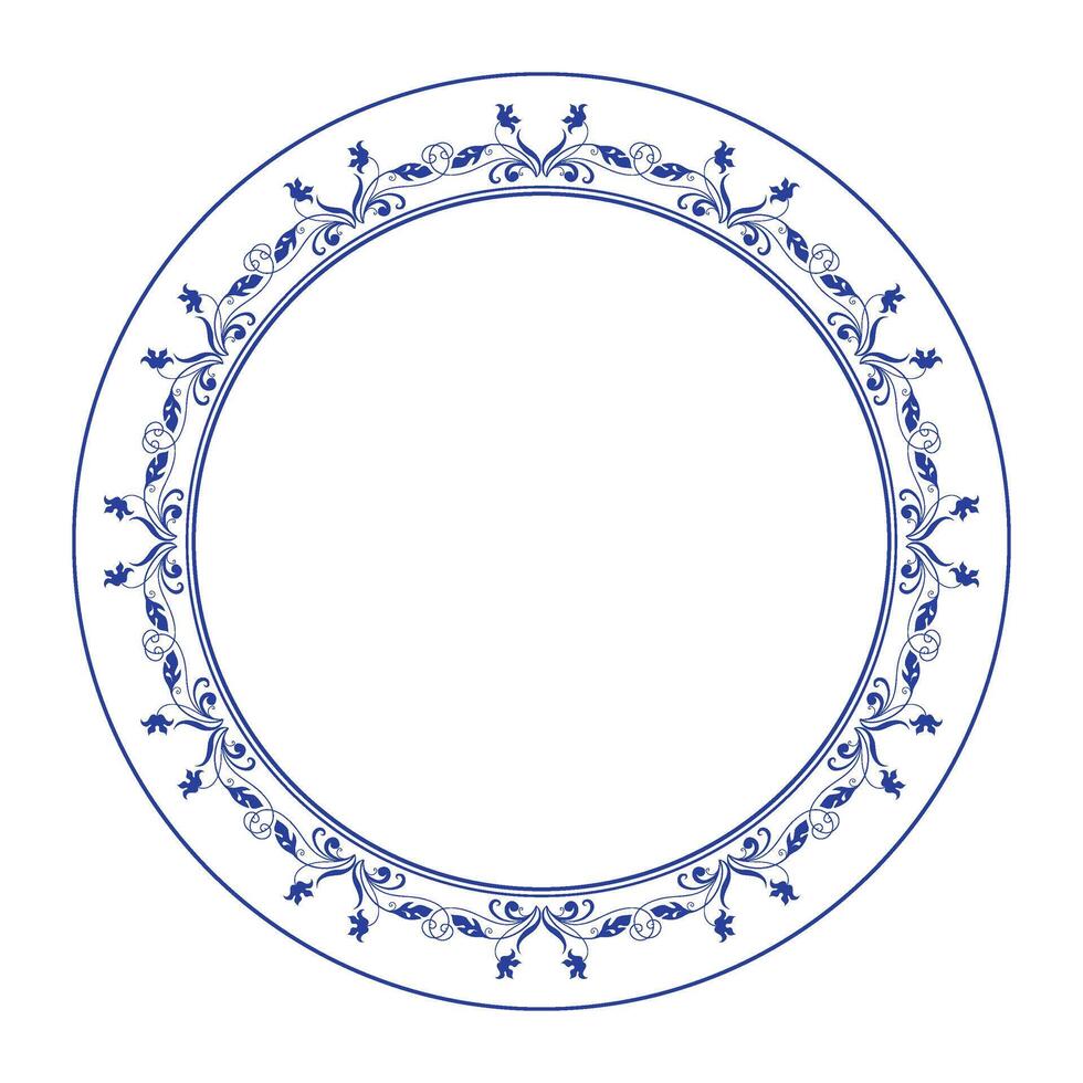Classic round frame with blue floral pattern on a white background. Circular ornamental frame an intricate pattern of swirling motifs. Refined aesthetic. Template for laser cutting, plate, porcelain. Pro Vector