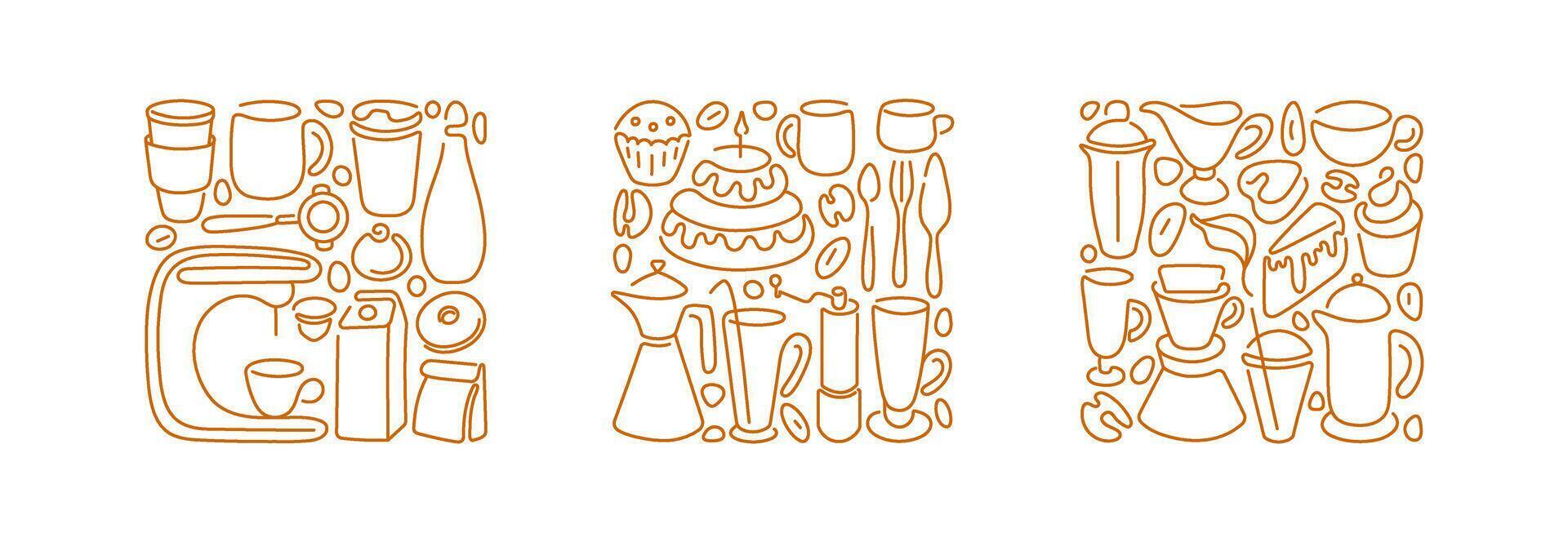 Coffee, tea, bakery line design. Sketch square set Pro Vector