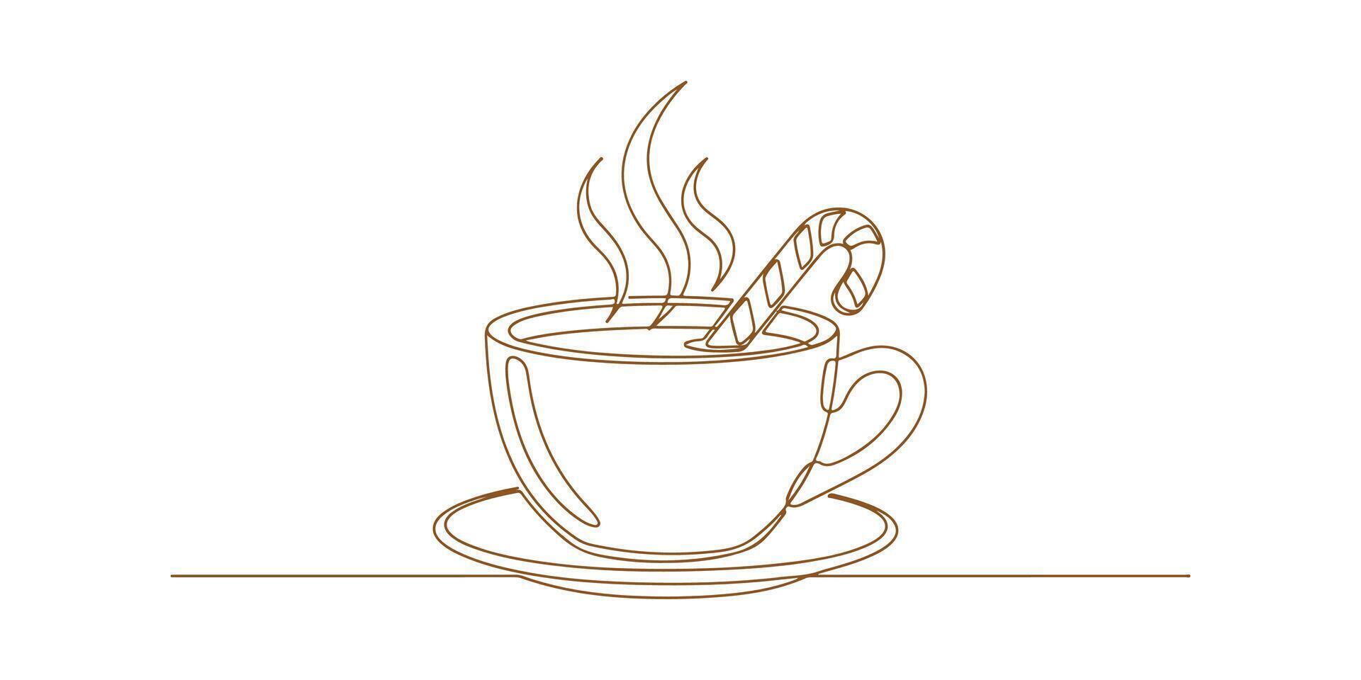 A continuous single line sketch of a steaming cup of hot chocolate with a peppermint stick. Pro Vector