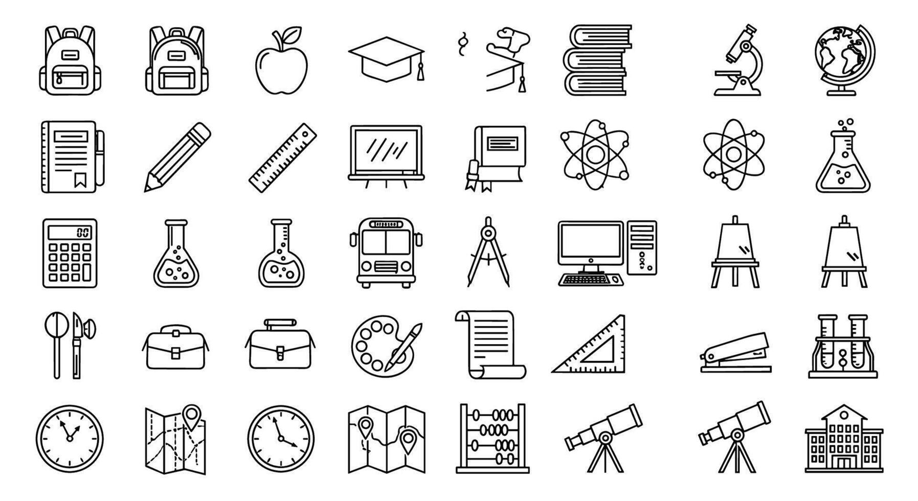 Collection of School and Education Icons Backpack Apple Graduation Cap Books Microscope Globe Computer Calculator Science Flask Bus Free Vector