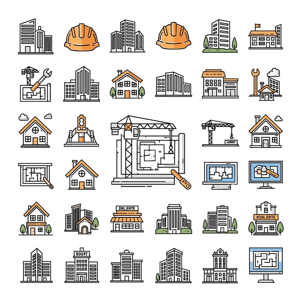 Construction Building Icons Set Outline Architectural Elements and Construction Tools for Urban Development and Engineering Projects Pro Vector