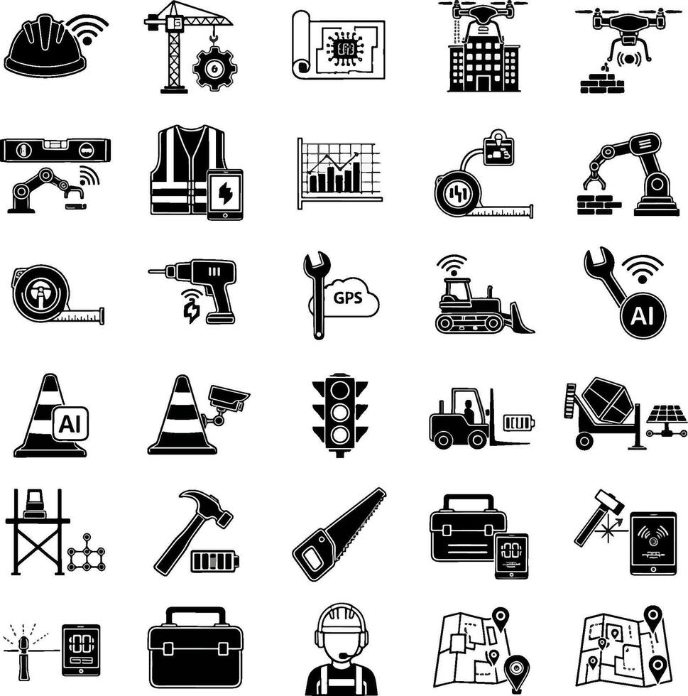 Construction and Technology Industry Icons Set with Smart Solutions AI Robotics and Digital Tools Pro Vector
