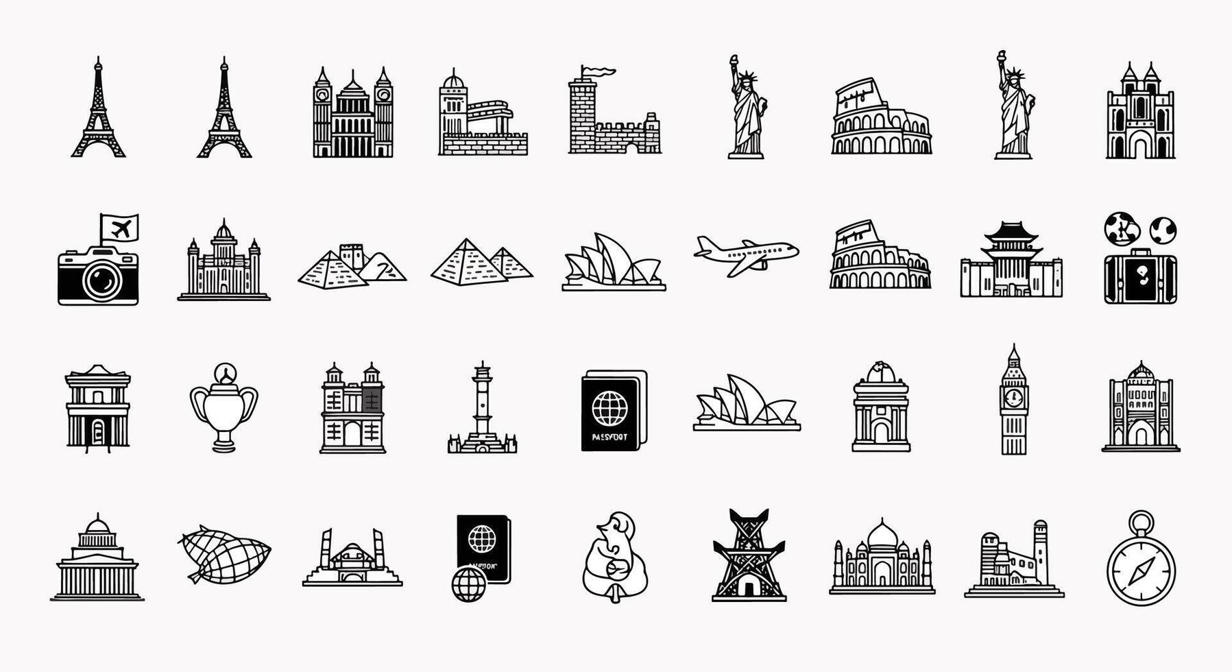 Collection of Famous World Landmarks and Travel Icons with Eiffel Tower, Pyramids, Colosseum and more vector