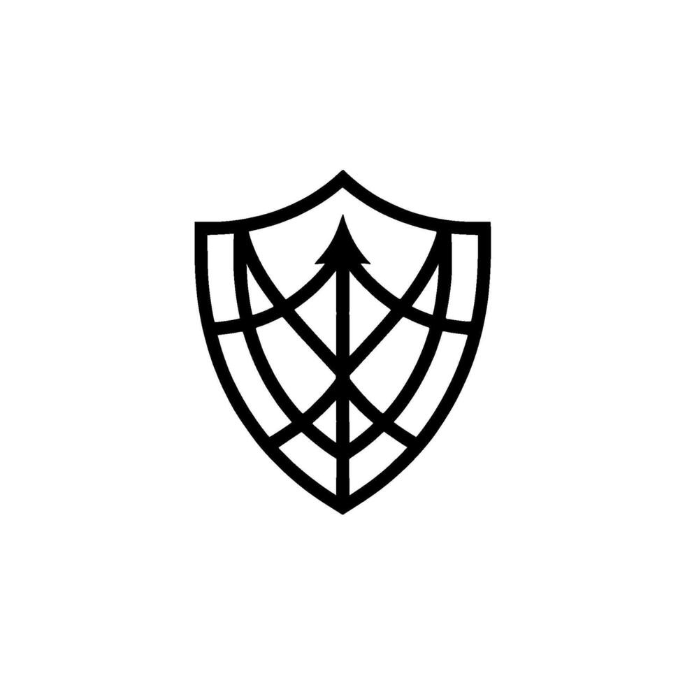 A sophisticated line art depicting a shield containing an upwardpointing arrow intersected by curved grid lines suggesting a globe or network Pro Vector