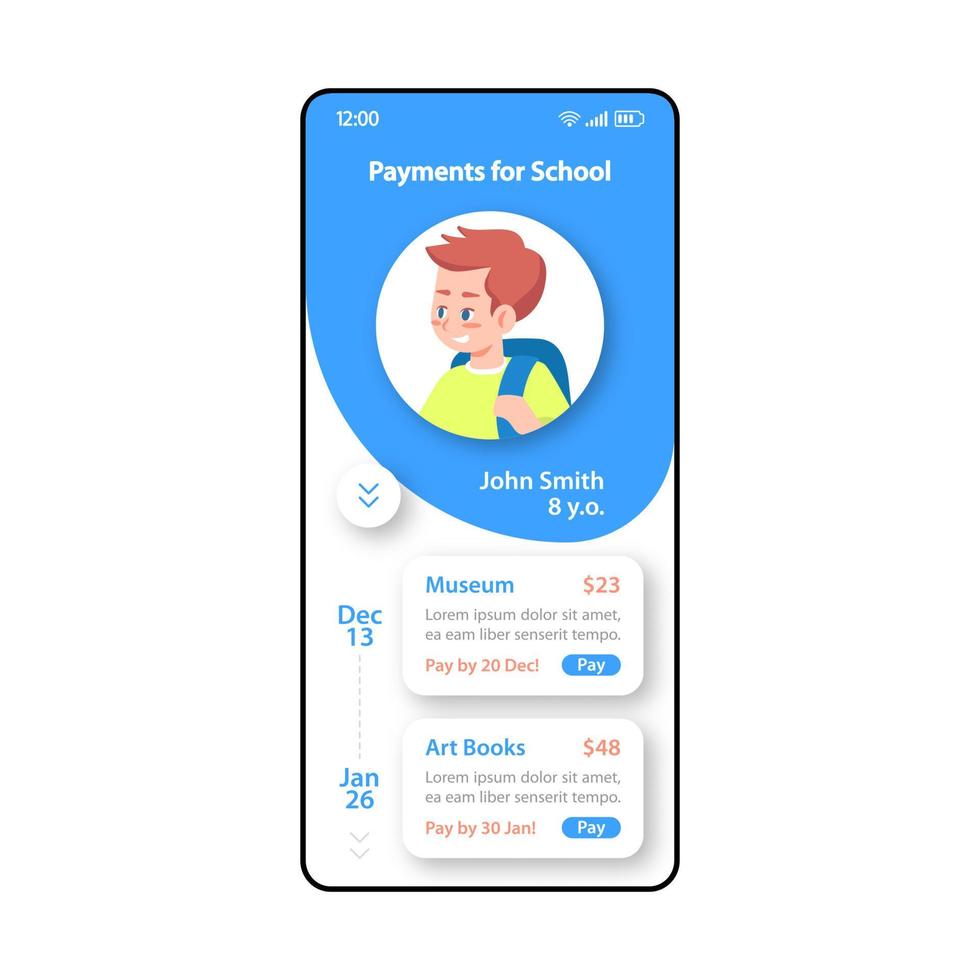 Payments for school smartphone interface vector template. Mobile app page blue and white design layout. Mobile banking screen. Flat UI for application. Online paying. Private school. Phone display Pro Vector
