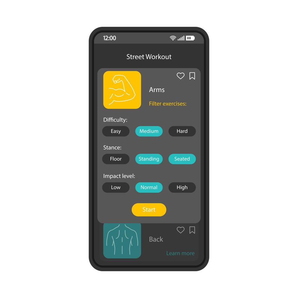 Street workout smartphone interface vector template. Mobile fitness app page black design layout. Sports training program screen. Personal trainer application UI. Exercises app. Phone display Pro Vector