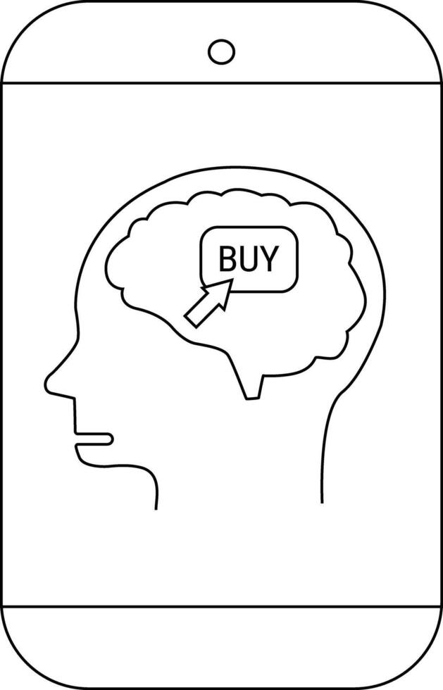 A phone displays a head silhouette with a brain containing a BUY button pointed to by an arrow Pro Vector