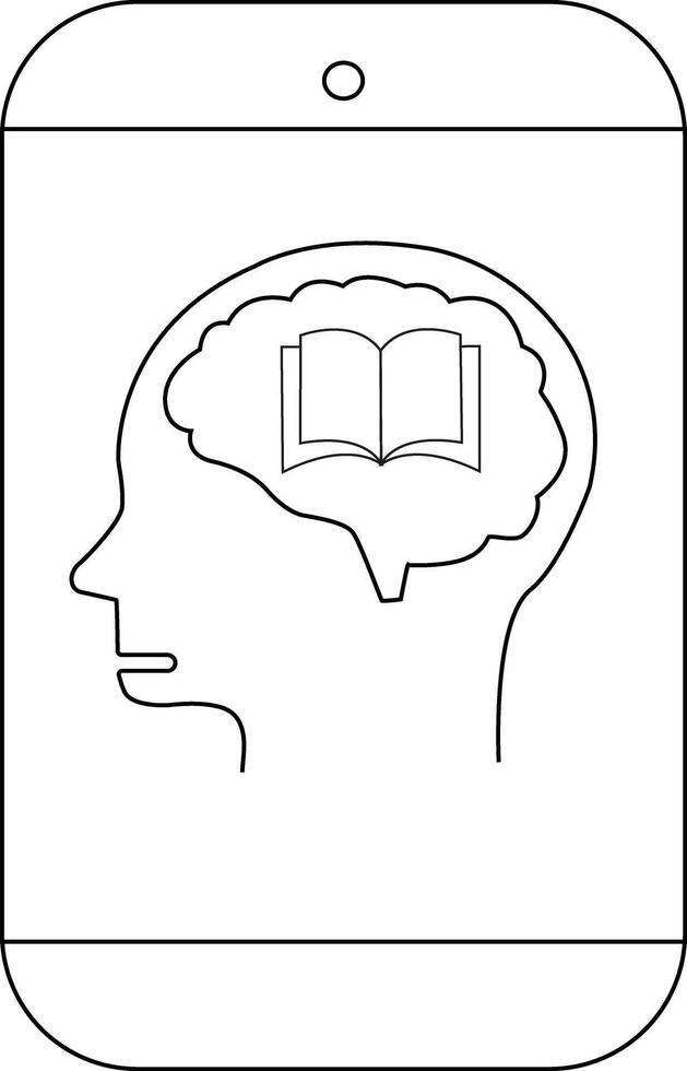 Smartphone display shows head profile with brain containing an open book Pro Vector