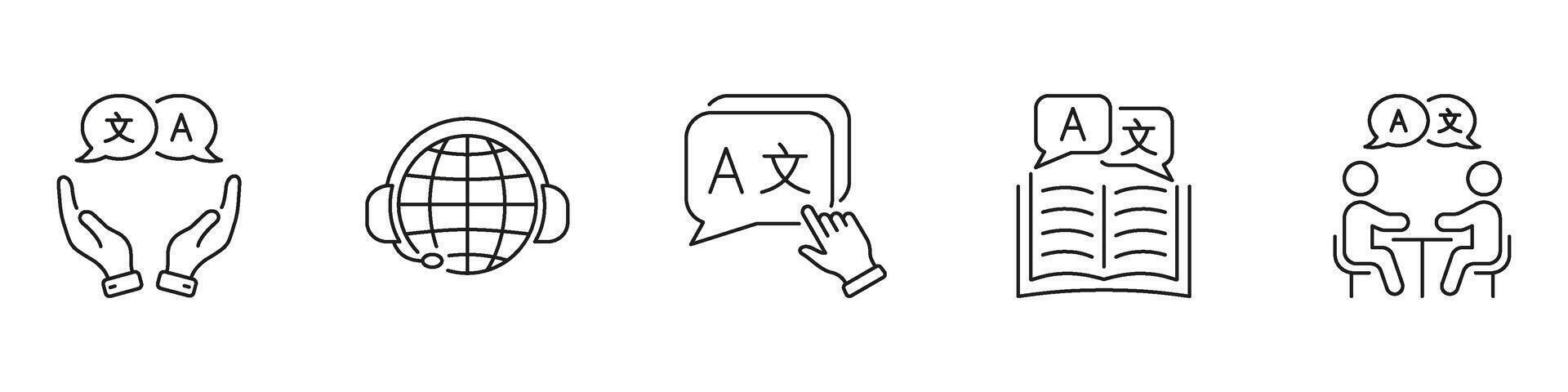 Language Translation And Communication Icon Set. Multilingual Support, Global Communication, And Language Learning Outline Symbol Collection. Editable Stroke. Isolated Illustration Pro Vector