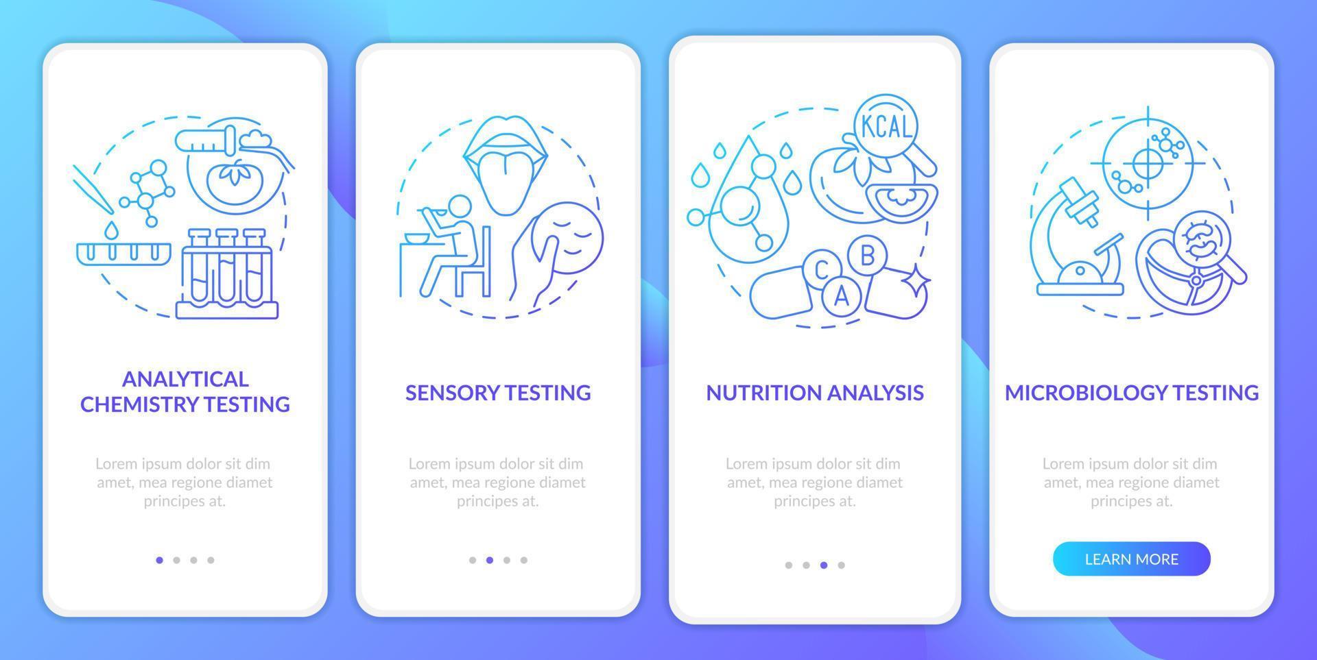 Food samples evaluation blue gradient onboarding mobile app screen. Walkthrough 4 steps graphic instructions pages with linear concepts. UI, UX, GUI template. Myriad Pro-Bold, Regular fonts used Pro Vector