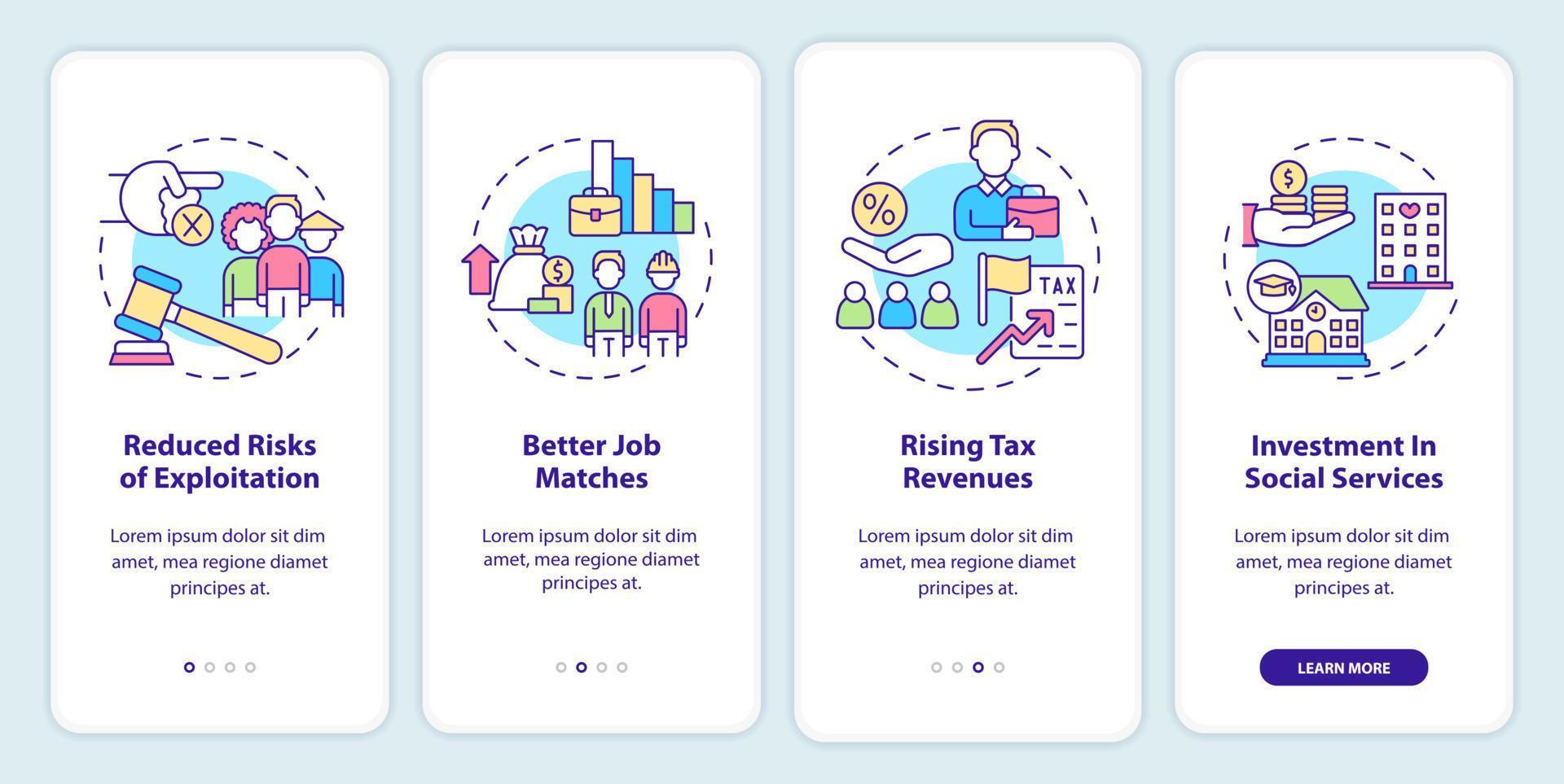 Positive impact of legalizing immigrants onboarding mobile app screen. Walkthrough 4 steps graphic instructions pages with linear concepts. UI, UX, GUI template. Myriad Pro-Bold, Regular fonts used Pro Vector
