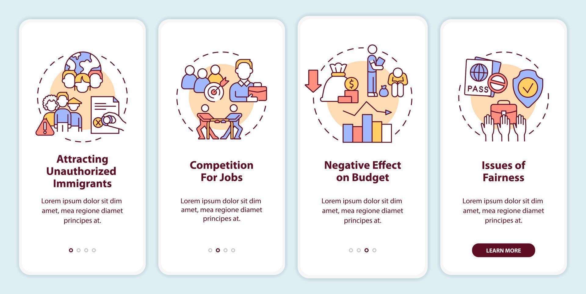 Legalizing immigrants bad impact onboarding mobile app screen. Walkthrough 4 steps graphic instructions pages with linear concepts. UI, UX, GUI template. Myriad Pro-Bold, Regular fonts used Pro Vector