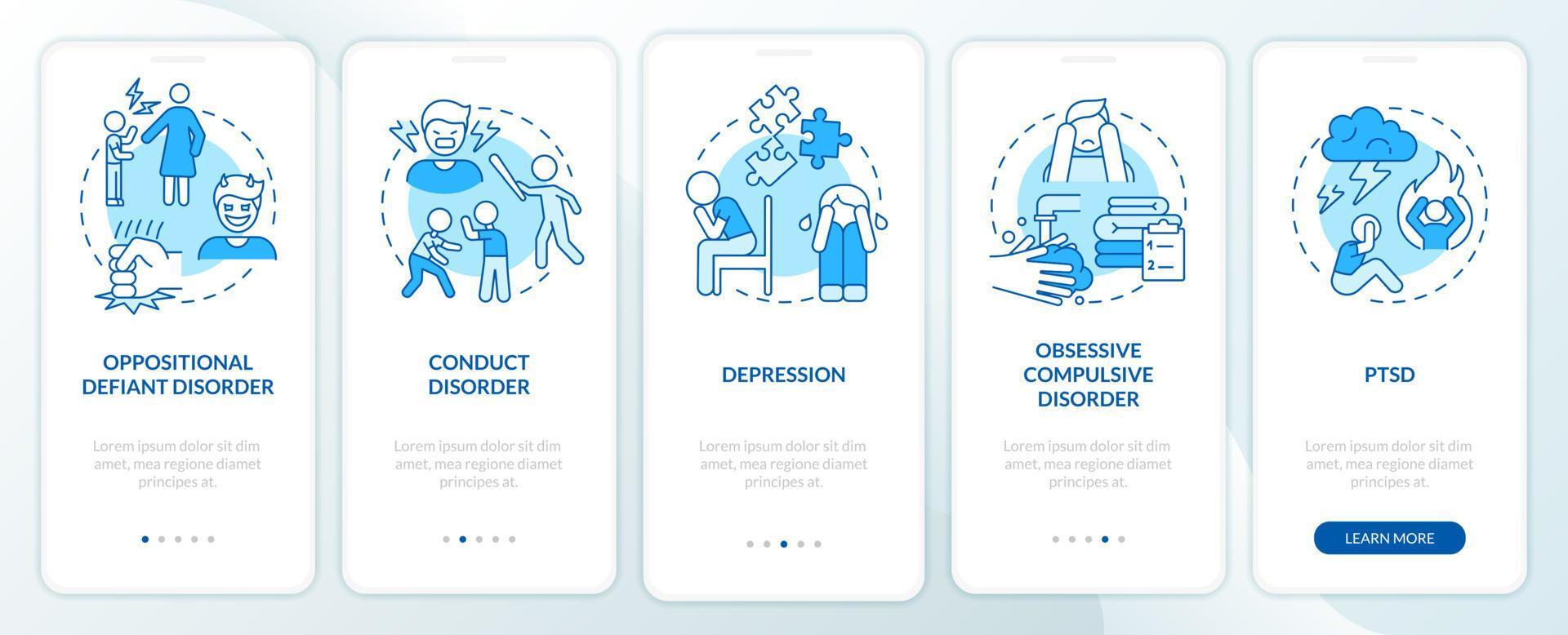 Childhood mental disorders blue onboarding mobile app screen. Walkthrough 5 steps graphic instructions pages with linear concepts. UI, UX, GUI template. Myriad Pro-Bold, Regular fonts used Pro Vector
