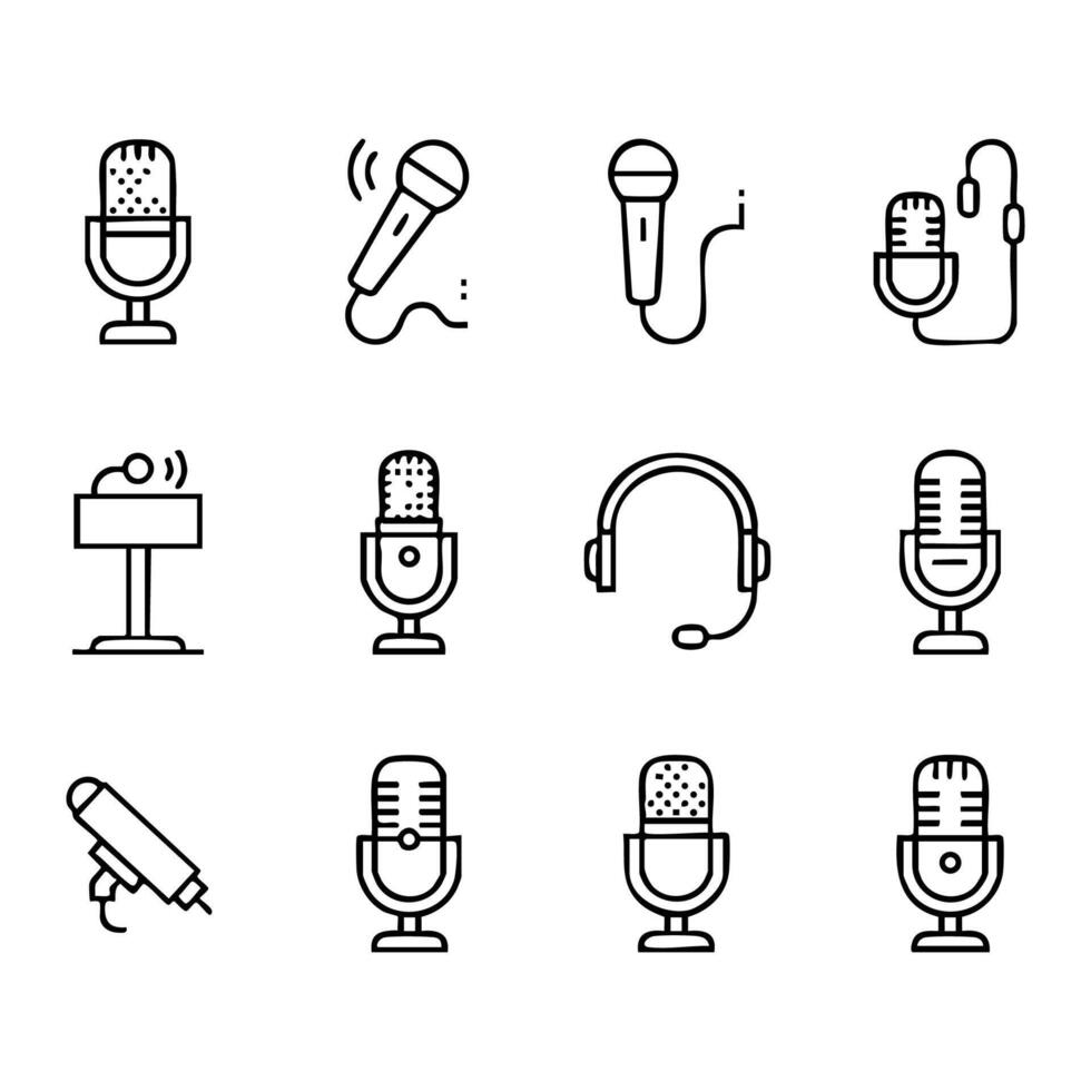 Collection of 12 microphone icons in outline style for audio recording communication and broadcasting applications Pro Vector