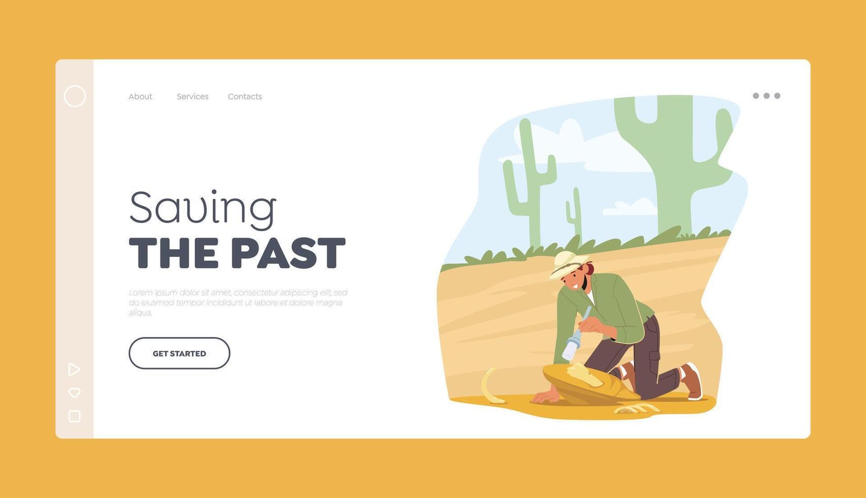 Paleontology Landing Page Template. Archeologist Explore and Studying Dinosaurs Fossil Skeleton Bones, Scientist Working Pro Vector