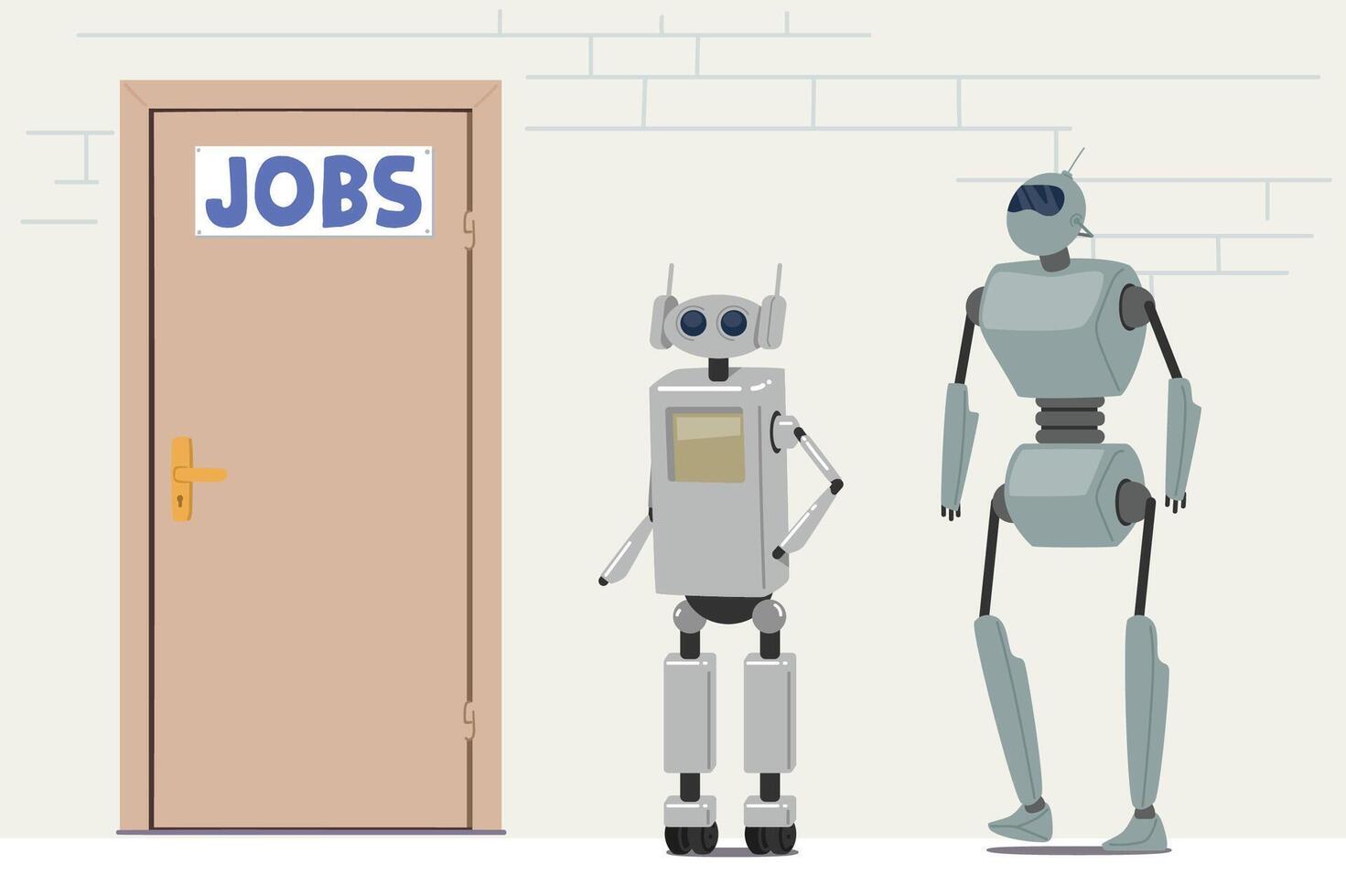 Robots Waiting Invitation for Job Interview at Lobby front of Door. Machine Characters Hiring in Office, Cyborg Hire Job Pro Vector