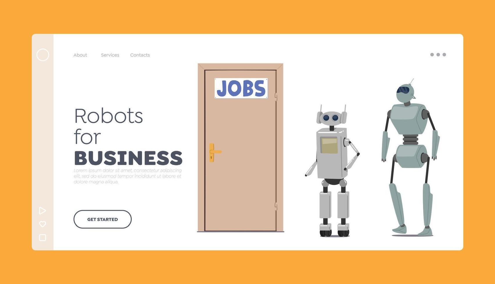 Cyborg Hire Job Landing Page Template. Robots Waiting Invitation for Job Interview at Lobby front of Door, Robotization Pro Vector