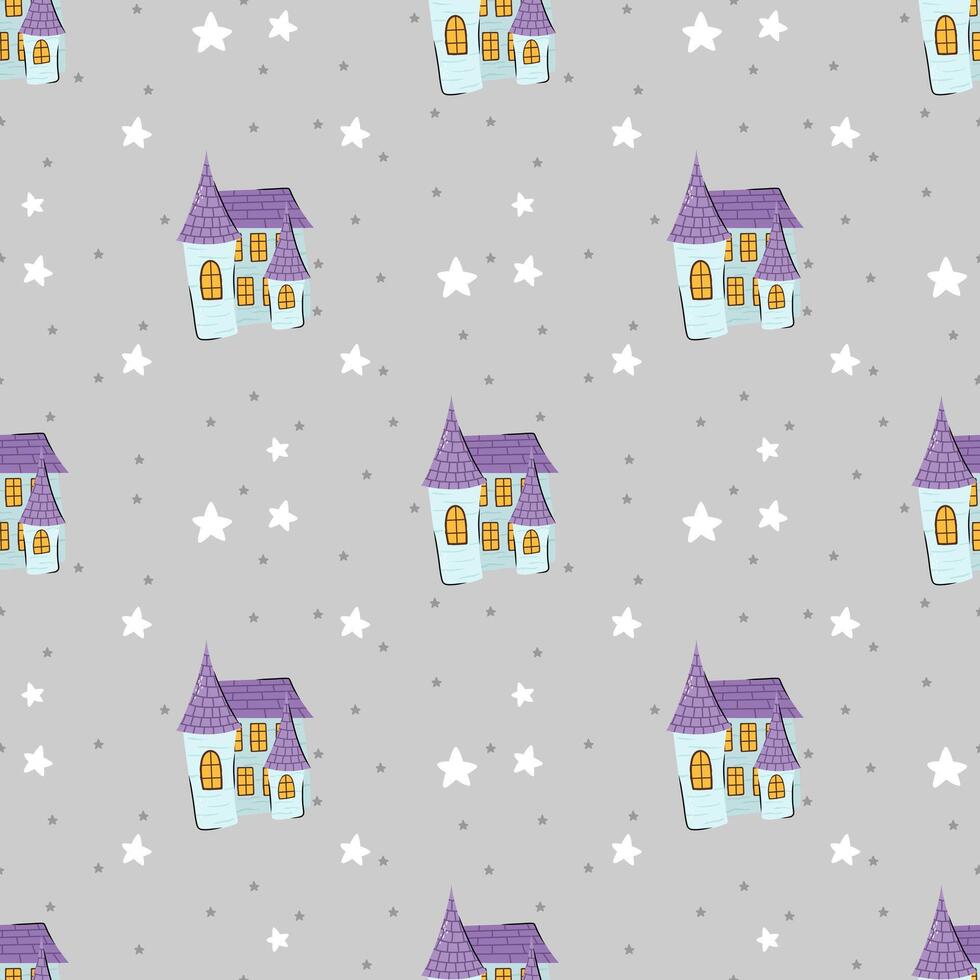 Cute seamless pattern with adorable castle with stars. background in Scandinavian style for design textile or backdrop Pro Vector
