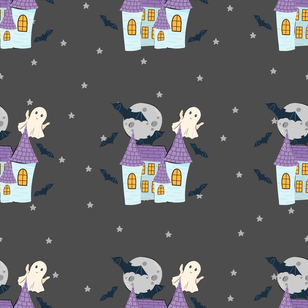 Seamless pattern with ghost, castle, full moon and bat. Dark background for design textile or backdrop Pro Vector
