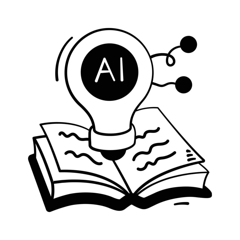 Doodle icon of AI bulb and book representing machine knowledge learning. Pro Vector