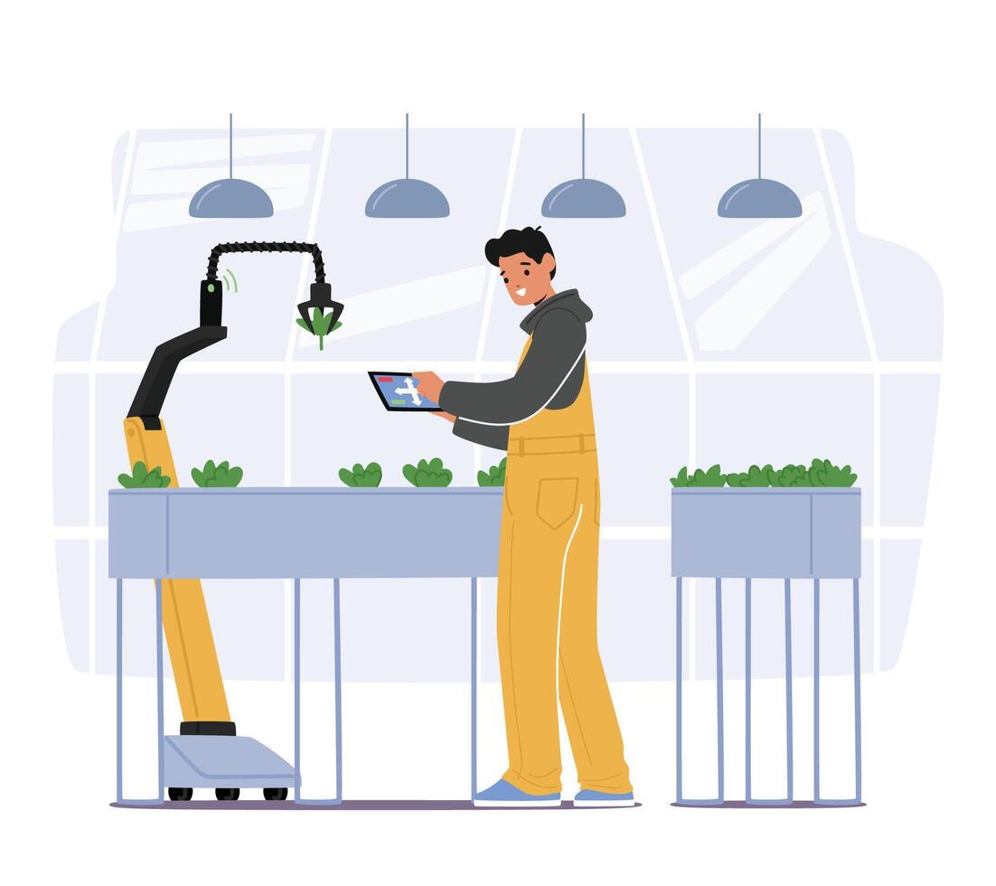 Farmer Character Planting Seedlings Using Automated Robotics Technologies And Smart Iot Control For Greenhouse And Farm Pro Vector