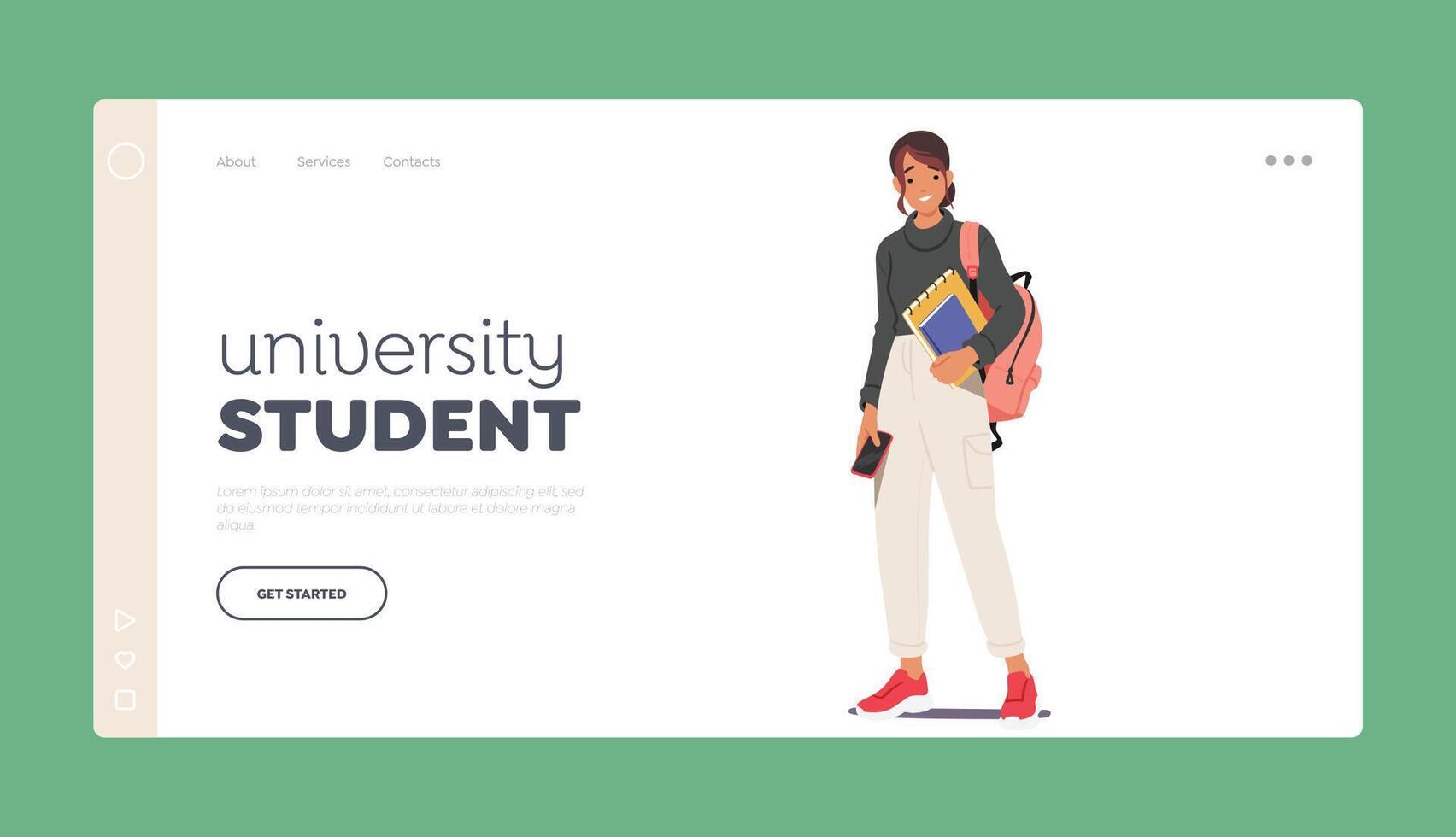 University Student Landing Page Template. Girl Character With Books Portrays An Enthusiastic Learner Illustration Pro Vector