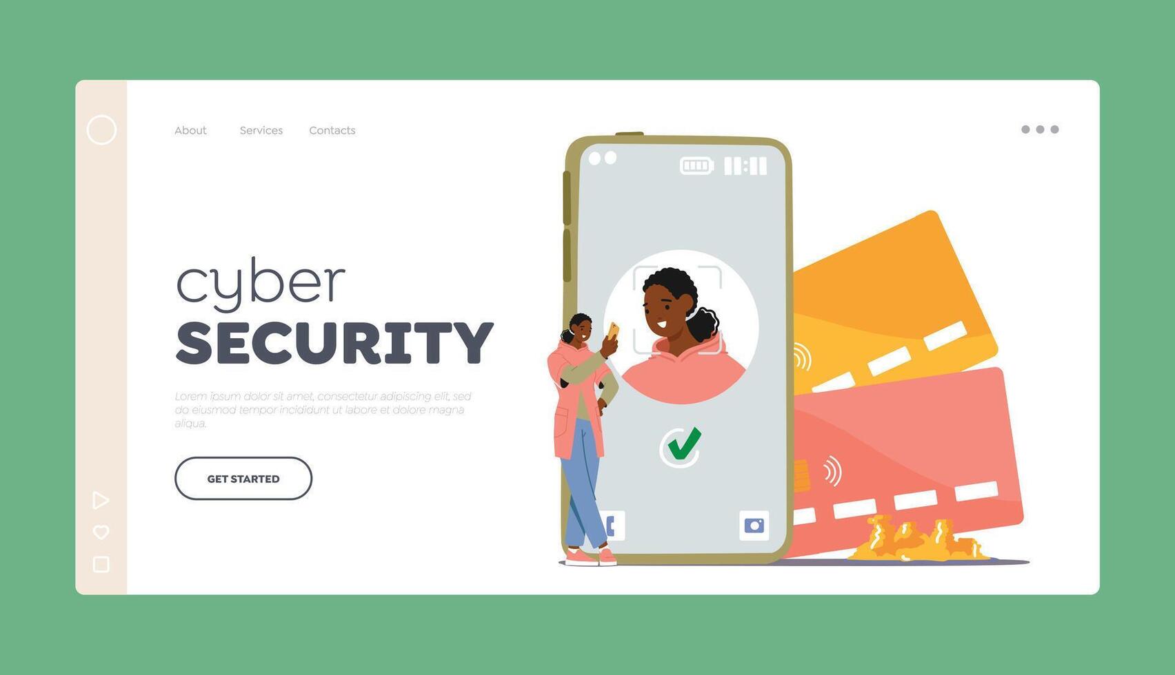 Cyber Security Landing Page Template. Tiny Female Character Standing Next To A Huge Phone with Face Recognition System Pro Vector