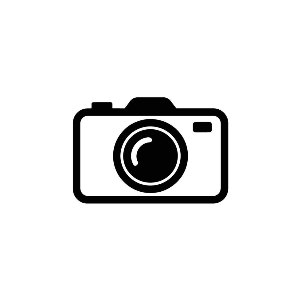 Black and White Icon of Camera with Lens, Shutter Release, and Rectangular Body Pro Vector