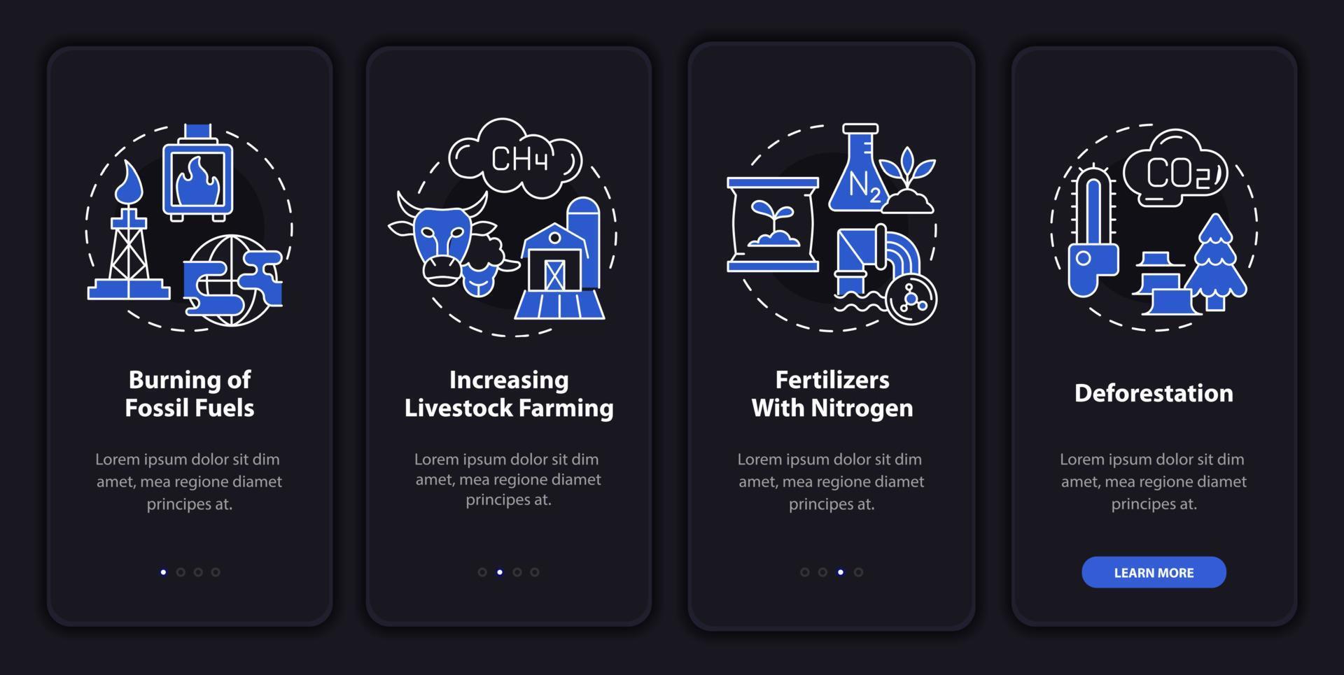 Reasons for climate change night mode onboarding mobile app screen. Walkthrough 4 steps graphic instructions pages with linear concepts. UI, UX, GUI template. Myriad Pro-Bold, Regular fonts used Pro Vector