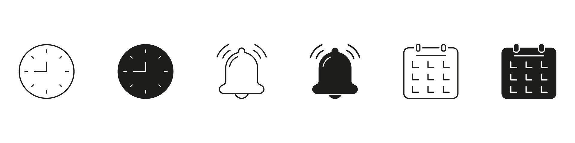 Clock, Bell, And Calendar Line And Solid Icon Set. Time Management, Reminder Notifications, And Scheduling Outline And Silhouette Symbol. Efficient Planning Tools. Isolated Illustration Pro Vector