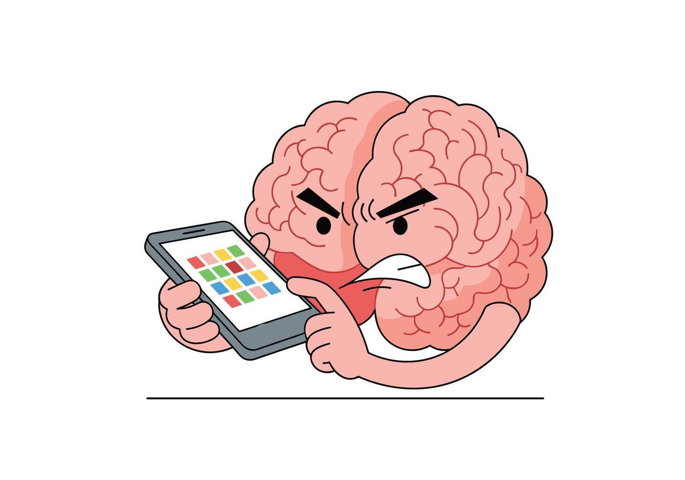 An angry red brain is furiously crushing a smartphone symbolizing frustration with technology. Pro Vector