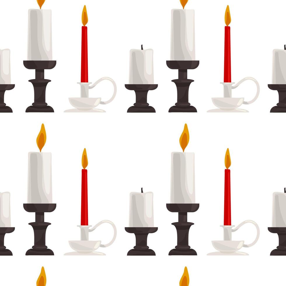 Seamless pattern row of candles with some of them lit on a white background. Pro Vector