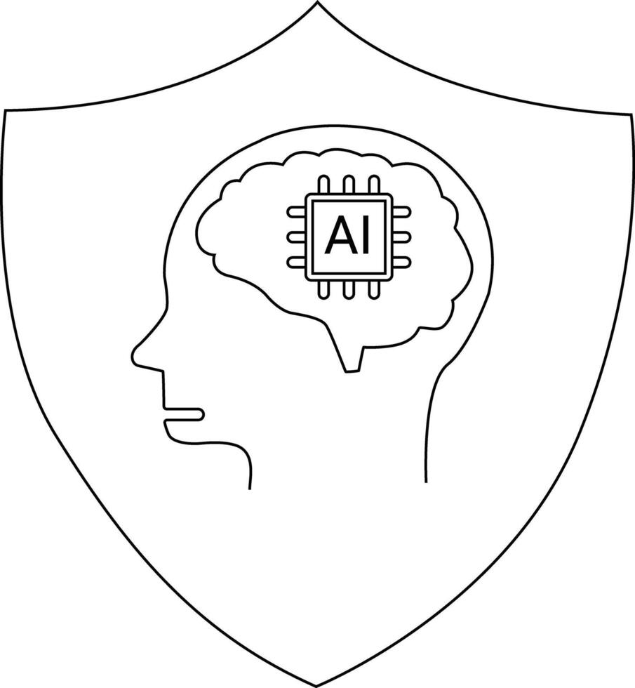 A profile within a shield shows a brain with an AI microchip at its center Pro Vector
