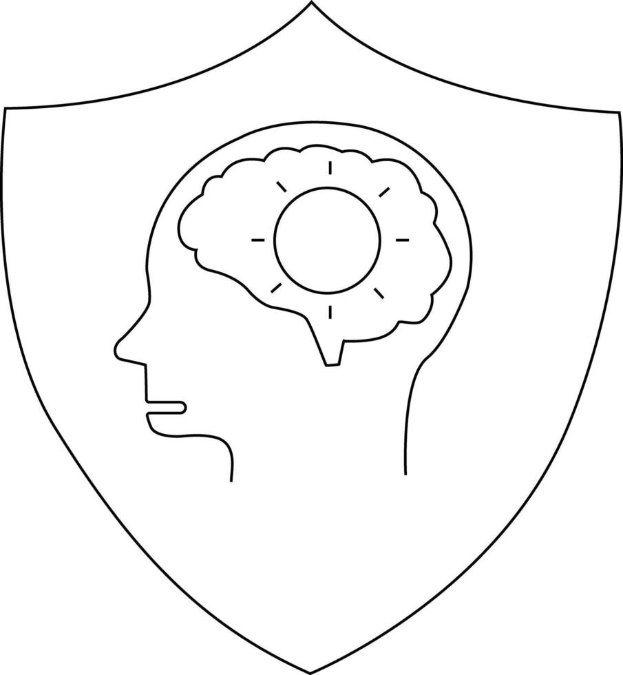 A line drawing of a head profile with a brain containing a sunlike circle all within a shield Pro Vector