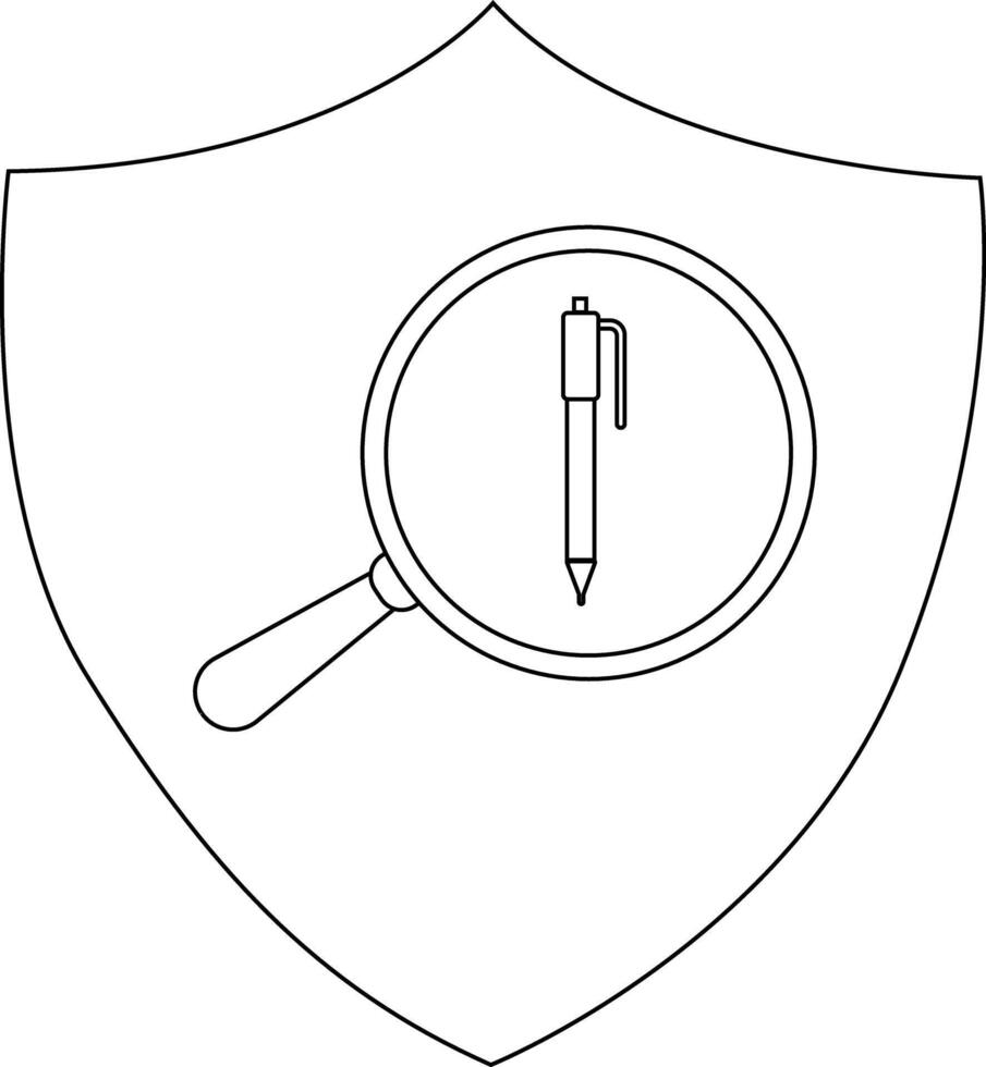 A shield emblem features a magnifying glass focused on a pen centered against a plain backdrop Pro Vector