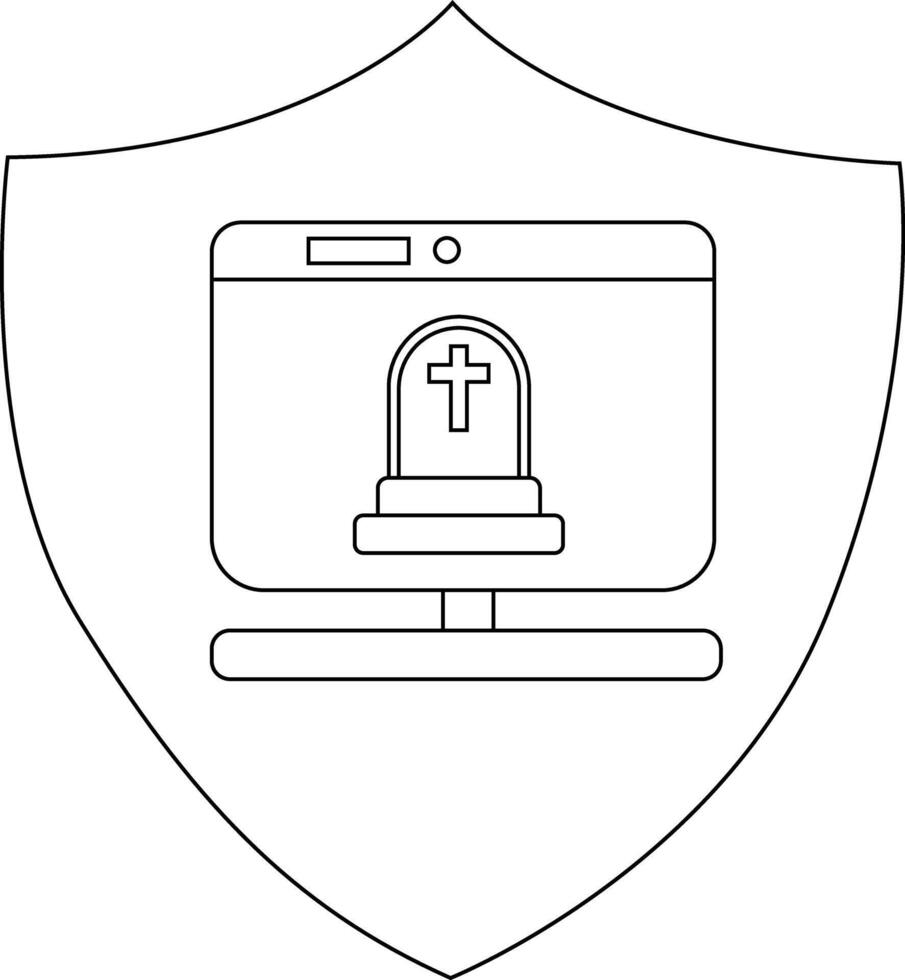 A shield emblem displays a computer monitor showing a tombstone icon on its screen Pro Vector
